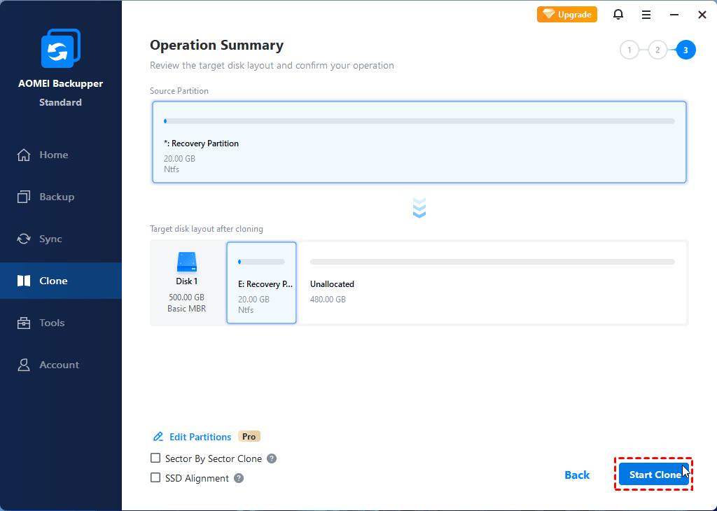 Step 4. Here you need to confirm all the information. If there is no problem, click Start Clone to launch the whole progress. If you are cloning recovery partition to SSD, you can check the box in front of “SSD Alignment” before clicking Start Clone to optimize the performance of the SSD.