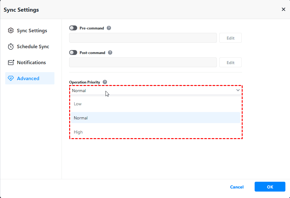 Command: In this option, you can set the pre-command and post-command so that it will run the specified program or script before or after synchronization.