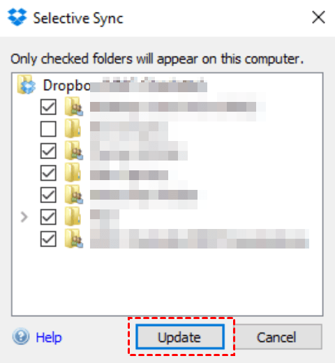 3. Once a sub-window pop up, you can check or uncheck specific folders or sub-folders to sync to the computer you are currently using. Then click Update to save your changes.