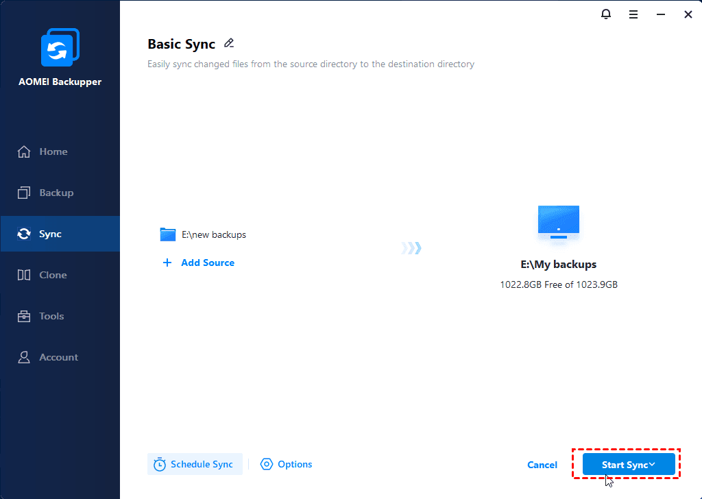 6. Click on Start Sync > Add the schedule and start sync now to perform the operation. After the operation is finished, safely disconnect your USB drive.