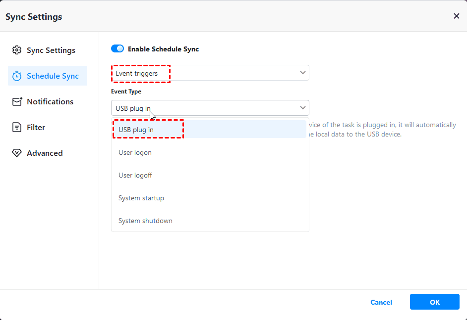 Schedule Sync: You can set a file sync task to run at fixed intervals. There are five schedule modes available (Daily, Weekly, Monthly, Event triggers, and USB plug in).
