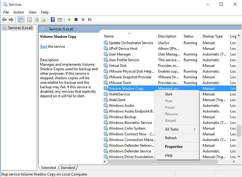 Click on Start, type services, and press enter to open the Services window. Roll down the mouse, and locate the service "Volume Shadow Copy", if its startup type shows Manual, right-click it, and select "Start" from the drop-down menu.