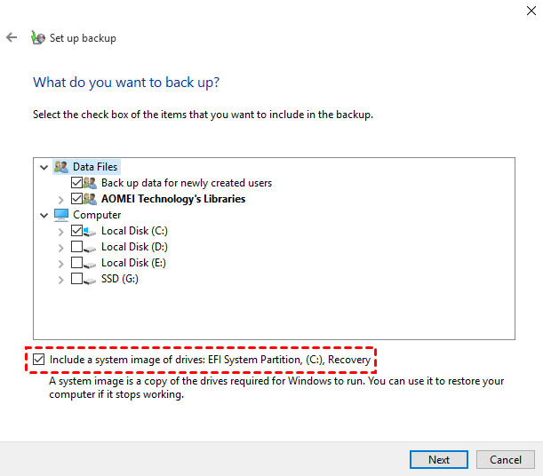4. Select Let Windows Choose or Let me choose and click “Next”. By default, it will include a system image if you don't uncheck the checkbox below.