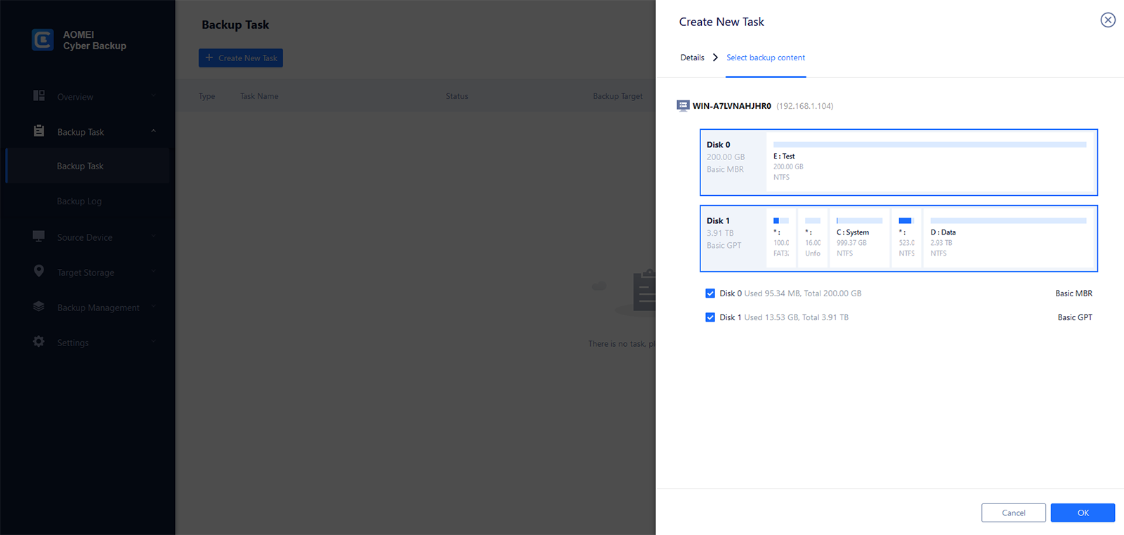 - Click Backup Task on the left menu bar and select Backup Task > Create New Task.