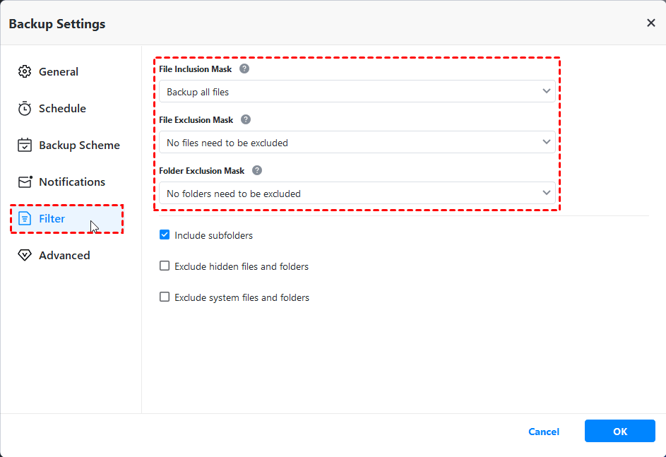AOMEI Backupper provides you with Filter settings to sync files with certain file extensions and save disk space. You can choose to include or exclude certain file extensions. Separate them with * if it is two or more. Refer to: backup files with certain file extension.
