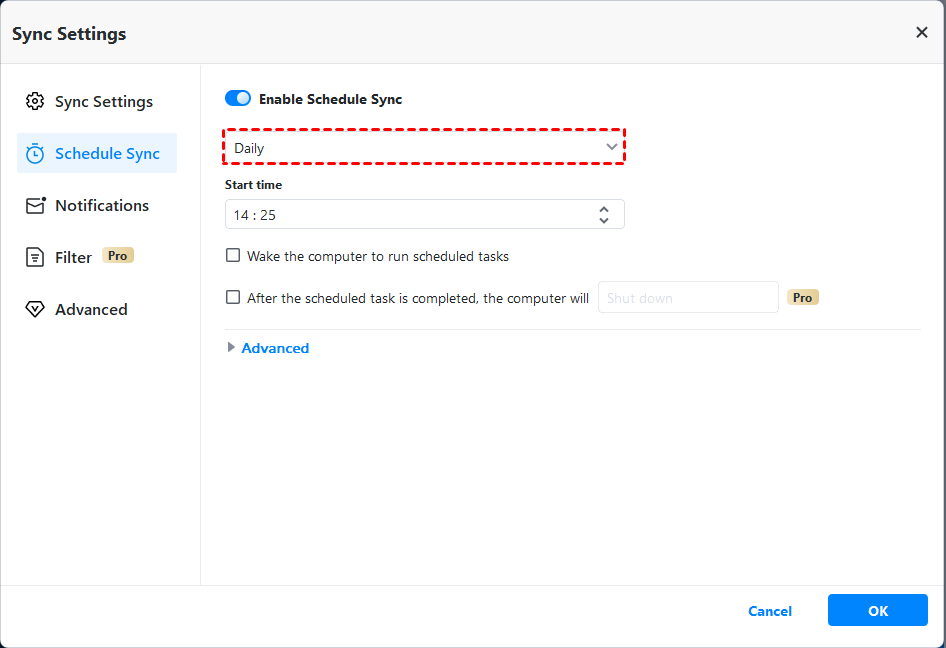 AOMEI Backupper only syncs all the photos currently in the Picture folder with the above steps. To add new photos in Pictures folder, you need to set daily, weekly, or monthly Schedule Sync for this task.