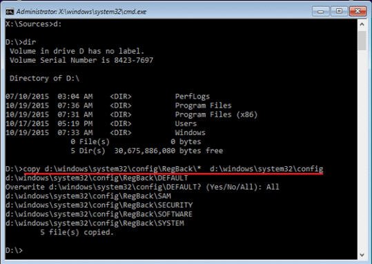 Step 2. Restore Windows registry from RegBack using the following command. if you are asked to overwrite files, type All and pressEnter.