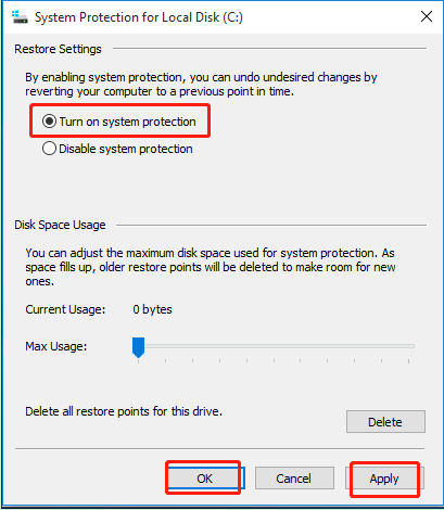 Step 4. Choose Turn on system protection. Then click Apply and OK to save changes.