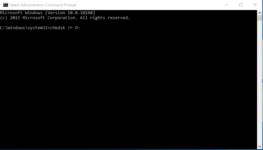 Step 2. In the pop-up command window, type chkdsk /r X: (X means the letter that represents your hard drive partition) and press Enter to run it. Here takes D drive for example.