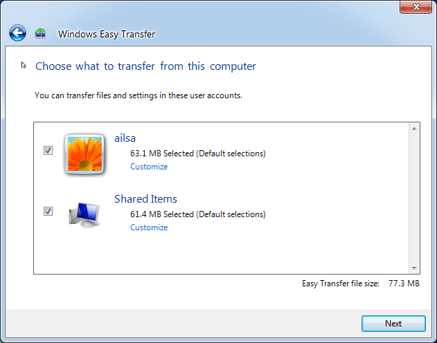 4. And Windows Easy Transfer will automatically detect all the data that can be transferred, and then press Next. You could click Customize -> Advanced to select data you want to sync.