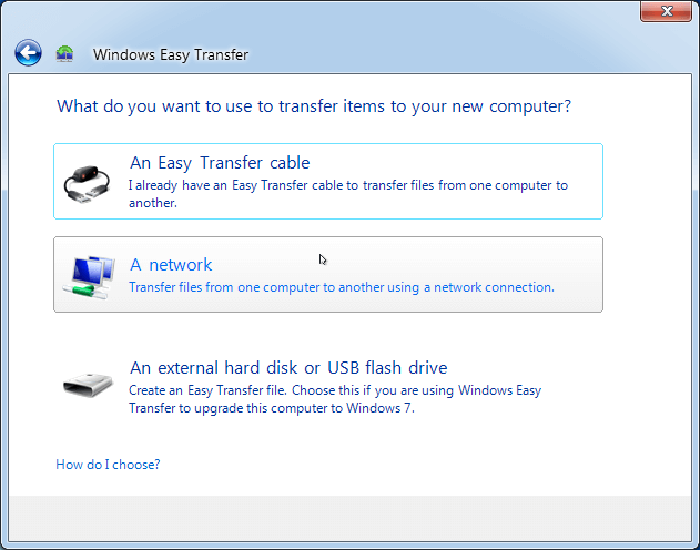 According to Microsoft, Windows Easy Transfer only support the following operating system. And it provides three ways to transfer data: an easy transfer cable, a network, or removable media like an external hard disk or USB flash drive.