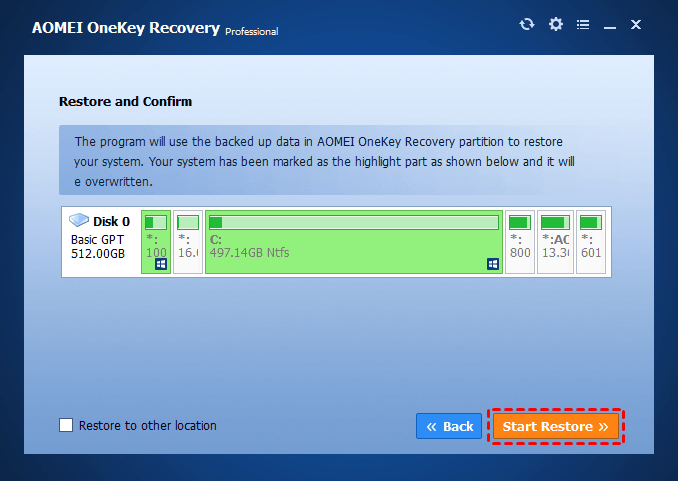 Here is brief guide on how to use AOMEI OneKey Recovery to recover a system image state. Make sure you've created a recovery partition before. You may refer to the steps on how to make a bootable recovery partition for creation if necessary.