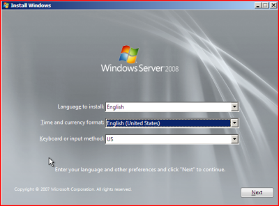 1. Insert the Windows Server installation disc on your new server (here is server 2008) and boot from it. Select the language and keyboard, and then click “Next”.