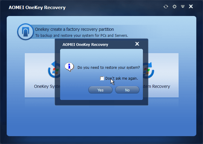 2. When AOMEI OneKey Recovery is loaded, you'll be asked, "Do you need to restore your system?" Click "Yes" to continue.