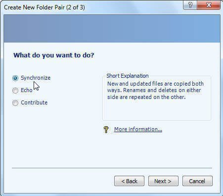- >>Echo (also called one-way file sync.): Transfer only changes from the left folder to the right folder.