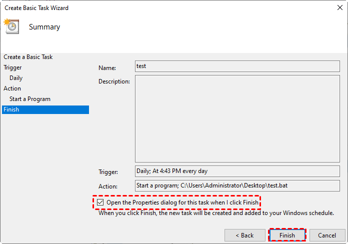 Step 9. Review the sync settings. Check Open the Properties dialog for this task when I click Finish and click Finish.