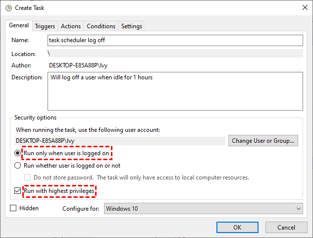 - In the General tab, check Run whether user is logged on or not and Run with highest privileges.