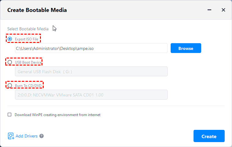 👉 If you tick the Download WinPE creating environment from internet option, the Windows Creating Environment will be downloaded before making Window PE. When there is a network connection and it is detected that the system does not have a WinPE creating environment, this option will be ticked automatically.