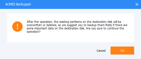 You will notice the warning after you select the destination disk. It goes as the existing partitions on the destination disk will be overwritten or deleted. Before you continue the operation, you’d better backup disks before your operation.