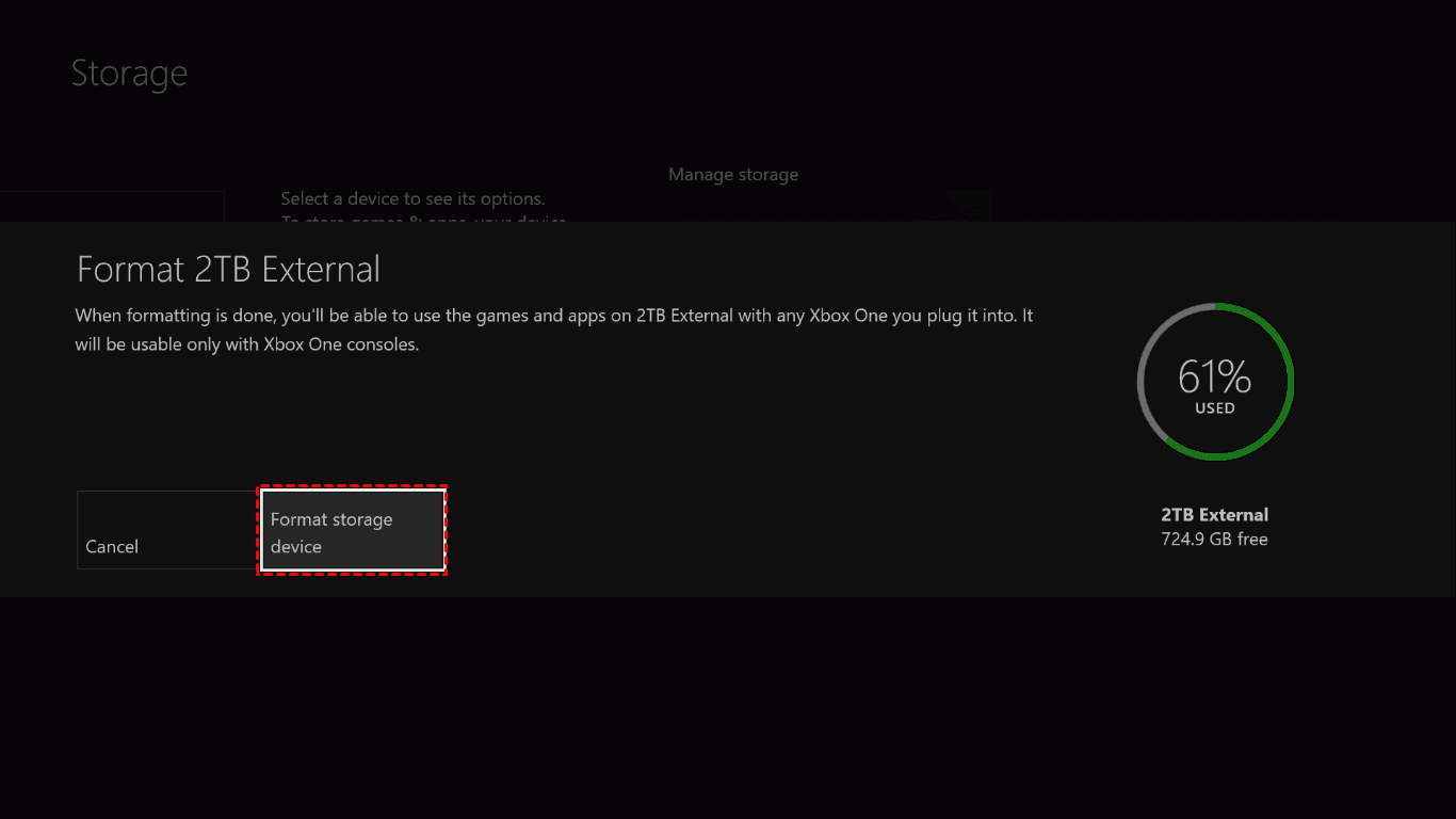 2. Select the external drive, scroll down to the option “Format” and select “Format storage device”.