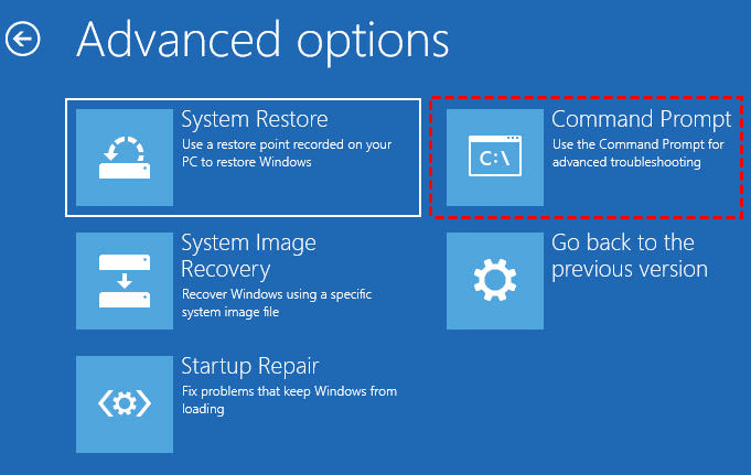 1. Get into the Command Prompt from Advanced options when you cannot get into Windows.