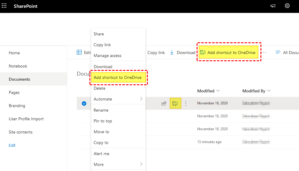 Add shortcut to OneDrive: With this feature in SharePoint, you can sync your Microsoft SharePoint files (library) to your OneDrive. You could access the SharePoint library in OneDrive directly. Also, if you use the OneDrive application, you could see the library folder in File Explorer.